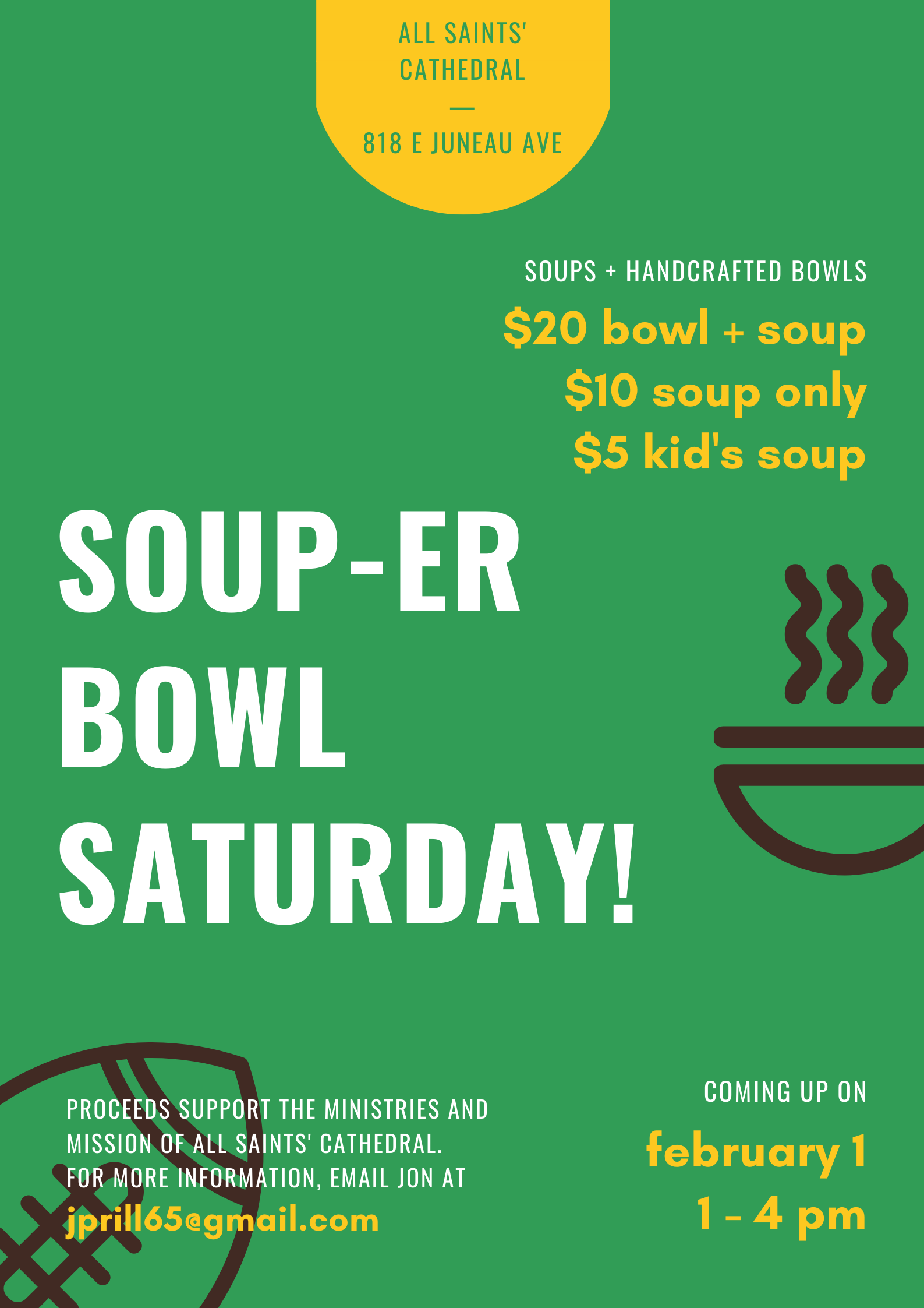 Spend the afternoon before the Big Game tasting homemade soup from many of our own chefs, listening to the music of Cheaper than Therapy, and socializing with friends. $20 will get you soup in a hand-crafted bowl of your choosing, $10 for soup only, and only $5 for kids.